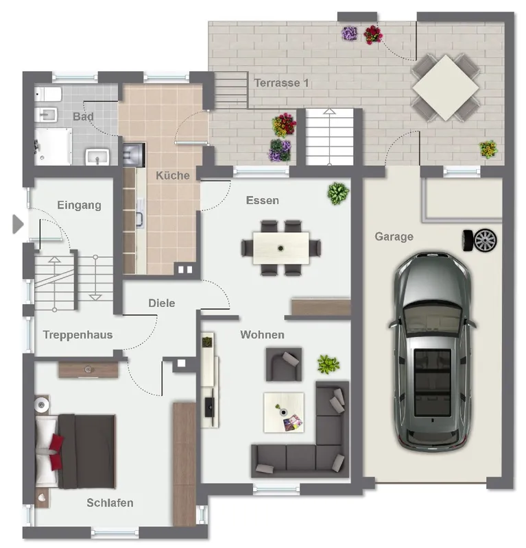 GartenansichtNebengebäude und HofBeispiel WohnzimmerBeispiel BadezimmerBeispiel Schlafzimmer2-3-FamilienhausGrundriss ErdgeschossGrundriss ObergeschossGrundriss Dachgeschoss