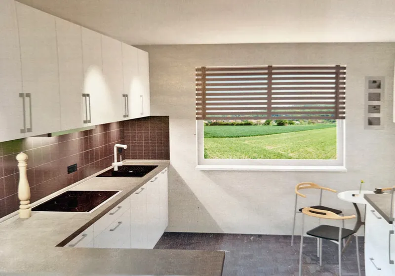 AnsichtWohn-/EssbereichWohn-/EssbereichKaminofenEinbauküche (Planungsskizze)Einbauküche (Planungsskizze)BüroBadezimmerSchlafzimmerKind1Kind2Kleines Zimmer (Gast)Terrasse hinter dem HausTerrasse vor dem HausGartenGarage