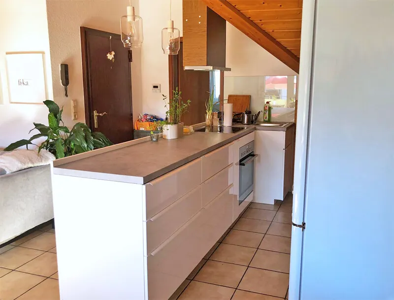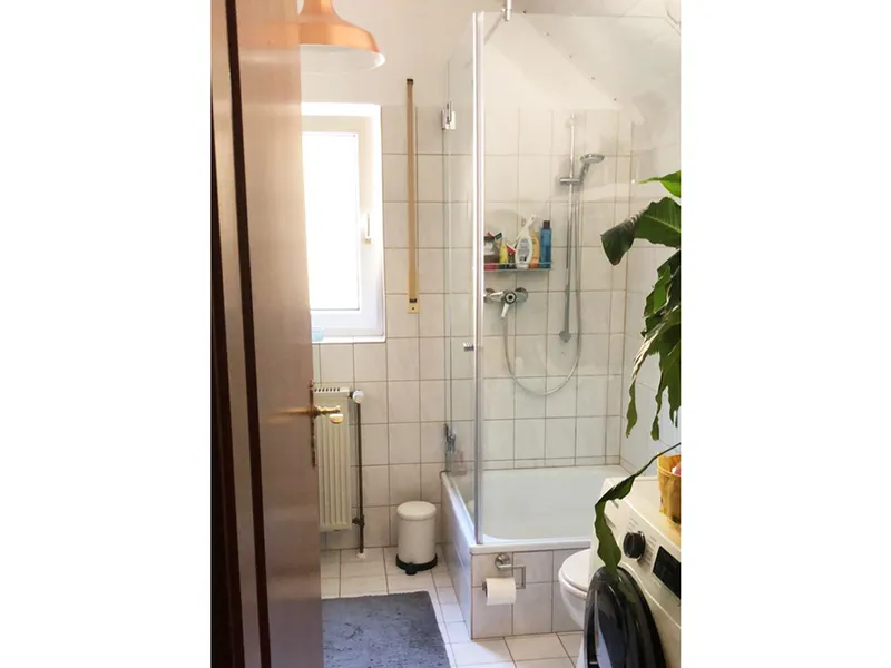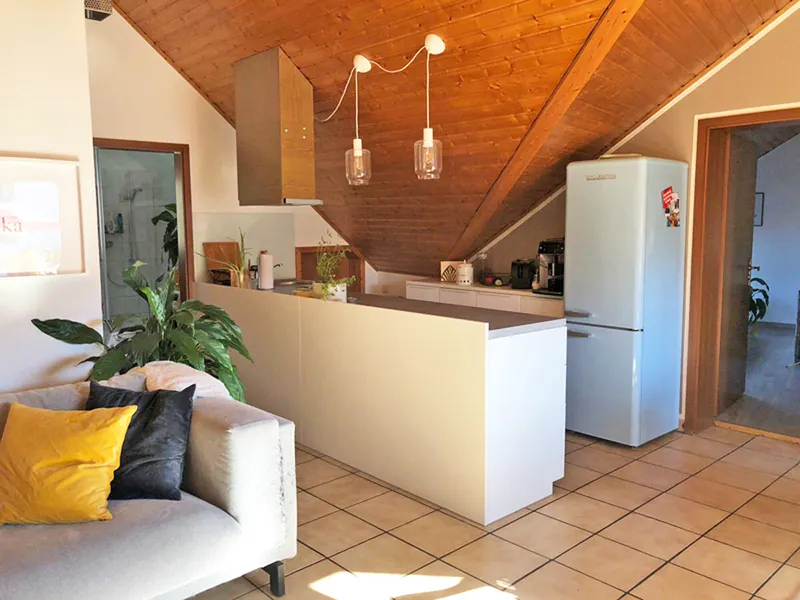 2-Zimmer-Dachgeschosswohnung mit offenem Wohn-/Ess-/Kochbereich, Einbauküche, geräumigem Schlafzimmer, Tageslichtbad, kleinem Abstellraum in der Dachschräge und Balkon in einem ruhigen 3-Parteienhaus.